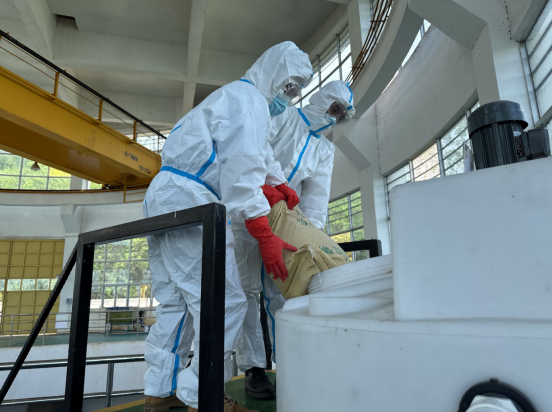 此次演練圍繞原水油跡污染及pH異常偏低兩個場景展開。演練中,發(fā)現“取水口出現少量油跡污染”后,吸水泵房巡檢人員立即上報并警戒現場,應急小組迅速攜帶攔油網、吸油毯趕赴現場,30分鐘內完成油污攔截與吸附,快速控制污染。隨后模擬原水pH值為6.3時,吸水泵房應急加藥系統迅速啟動,現場處置組協同配置藥劑、調試設備,精準投加調節(jié),不到1小時即讓水質穩(wěn)定在安全范圍。演練過程中,吸水泵房作為一線處置陣地,及時啟動應急預案,確保取水水質符合生產要求。同時,將觀洞水庫作為備用水源隨時待命,形成“即戰(zhàn)即防”的堅實防線。