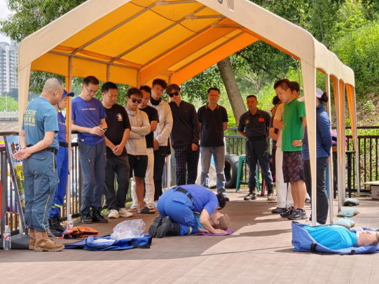 藍天救援隊結(jié)合近期發(fā)生的溺水和救援案例,現(xiàn)場拆解“黃金四分鐘”,他們帶領(lǐng)景區(qū)和經(jīng)營業(yè)態(tài)工作人員分組練習(xí),從清理呼吸道、開放氣道到精準按壓,逐一糾正手勢偏差。全域覆蓋從“專業(yè)隊”到“全員兵”的安全共識。接著,槳板運動協(xié)會與藍天救援隊分別對槳板救援、繩包救援、徒手救援等進行了系統(tǒng)化的培訓(xùn),景區(qū)內(nèi)各業(yè)態(tài)的工作人員也積極地參與了救援實踐的學(xué)習(xí)。