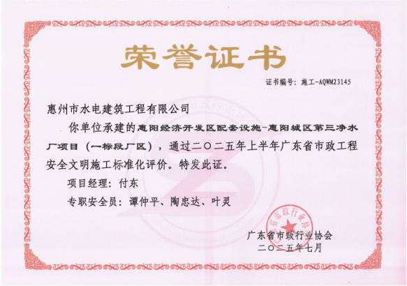 近日,由惠州水務(wù)集團(tuán)水電公司承建的惠陽(yáng)經(jīng)濟(jì)開發(fā)區(qū)配套設(shè)施—惠陽(yáng)城區(qū)第三凈水廠項(xiàng)目(一標(biāo)段廠區(qū)),順利通過2025年上半年“廣東省市政工程安全文明施工標(biāo)準(zhǔn)化”評(píng)價(jià)。這一榮譽(yù)不僅是對(duì)市水電公司項(xiàng)目管理與施工水平的高度肯定,更是對(duì)他們始終堅(jiān)持高標(biāo)準(zhǔn)、嚴(yán)要求推進(jìn)安全文明施工的生動(dòng)詮釋,為行業(yè)樹立了可借鑒、可推廣的標(biāo)桿典范。